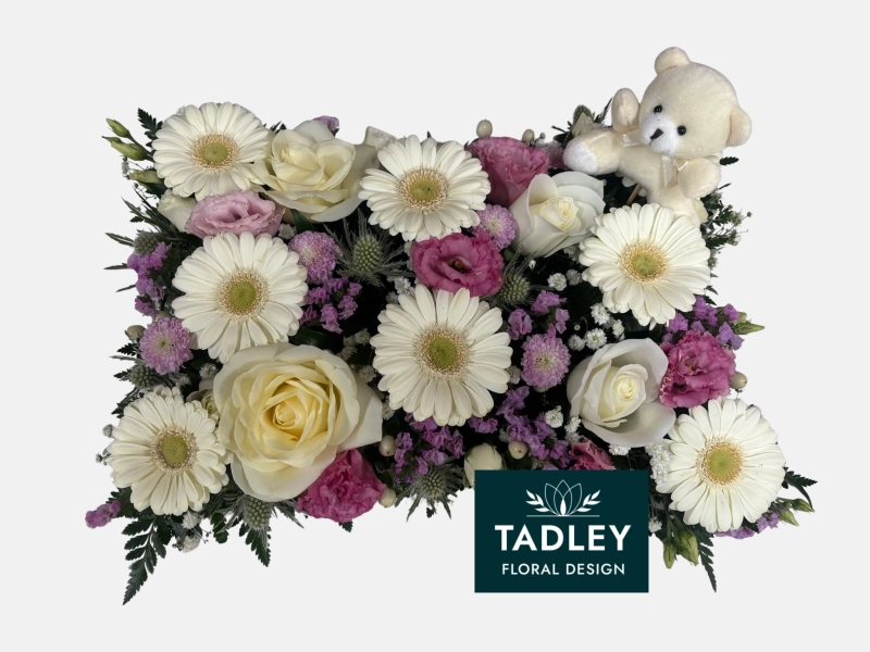 A peaceful pillow shaped arrangement made from white & pink flowers with greenery and cute small teddy.