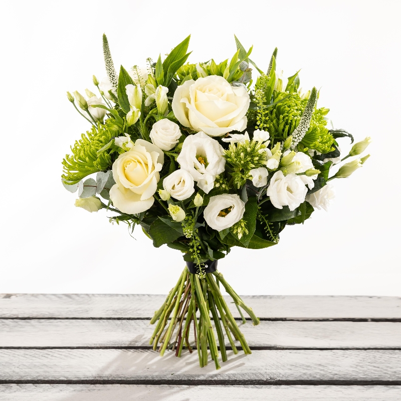 A contemporary bouquet of fresh flowers in shades of elegant white and greens. The Balmoral Bouquet includes seasonal blooms such as creamy roses, lisianthus, white veronica, and green chrysanthemum mixed with luxurious foliage.